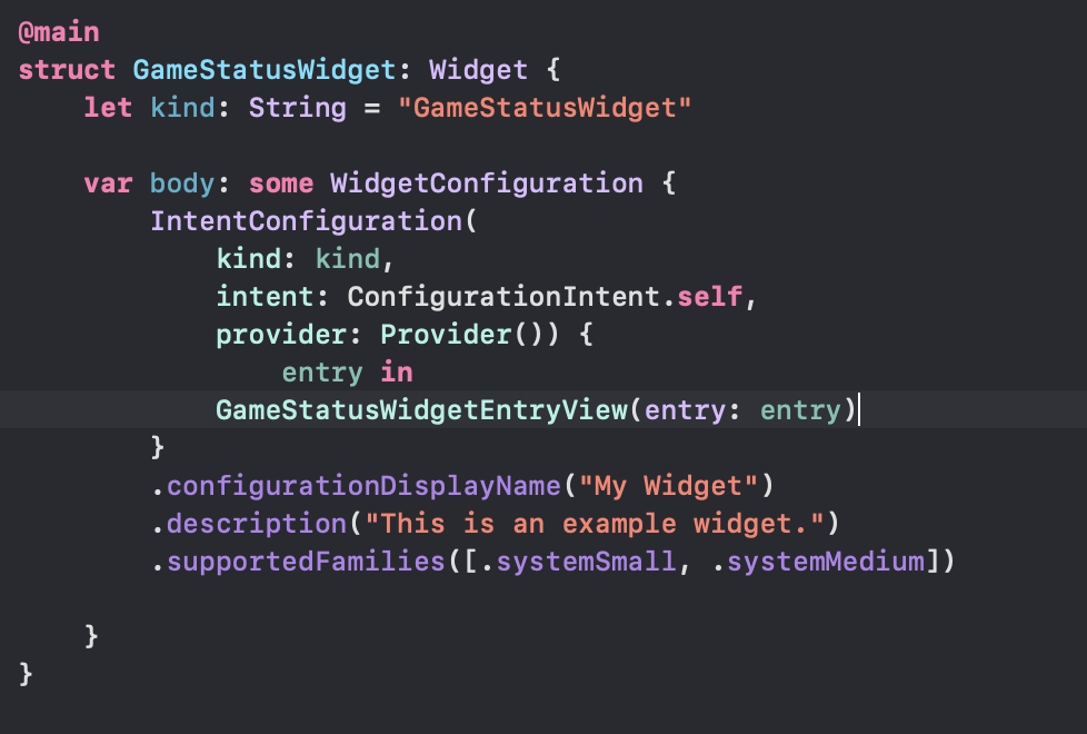 맨 마지막줄 supportedFamilies 를 이용해 어떤 크기위 위젯을 제공할 지 써주면 됩니다.
