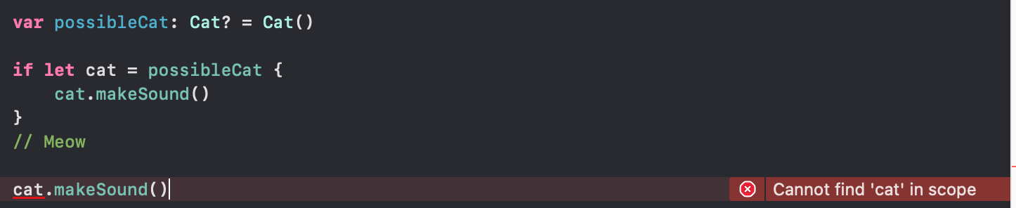 let이라는 상수에 possibleCat을 할당함으로써 옵셔널 값을 추출할 수 있습니다.